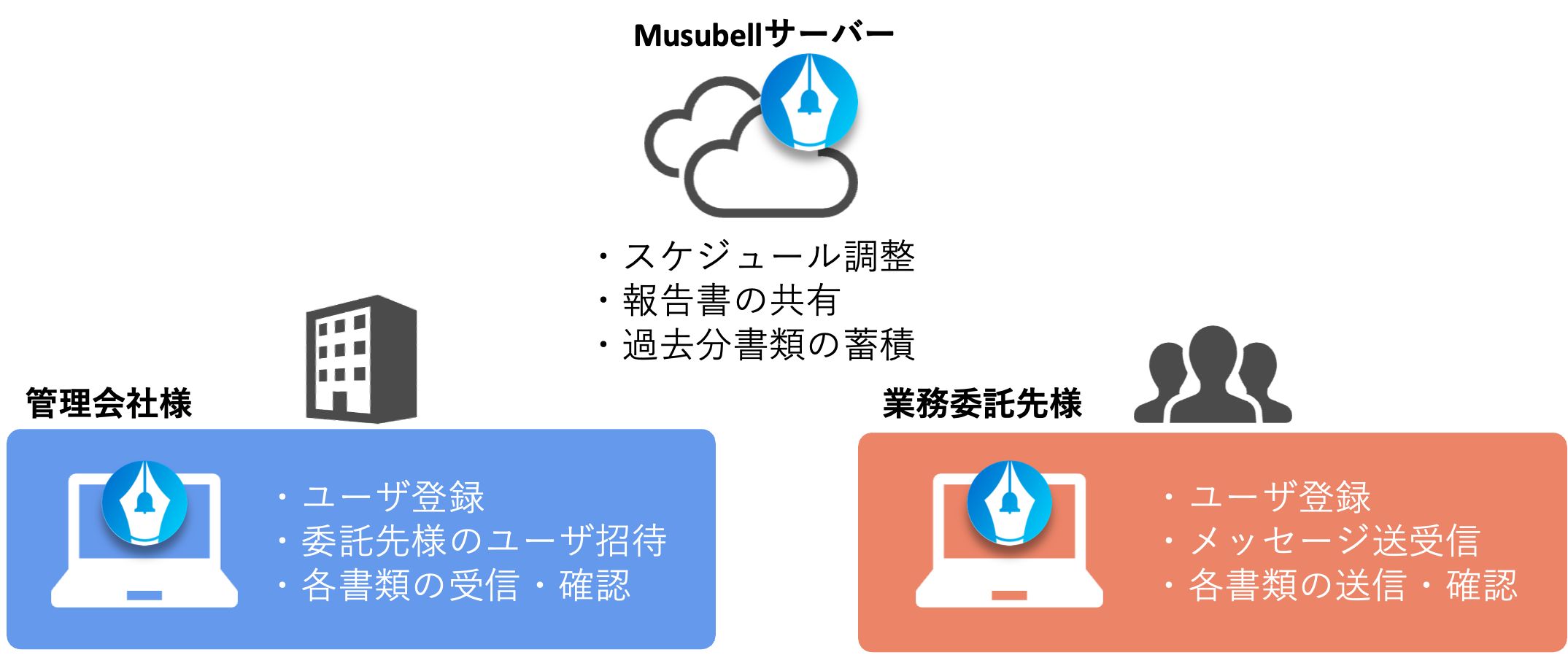 “Musubell(ムスベル)”とは? 2025年09月17日 07:06 更新 Musubellは、業務委託先様と管理会社様を繋ぐプラットフォームです。業務委託先様と管理会社様のコミュニケーションにお使いいただくことが可能です。