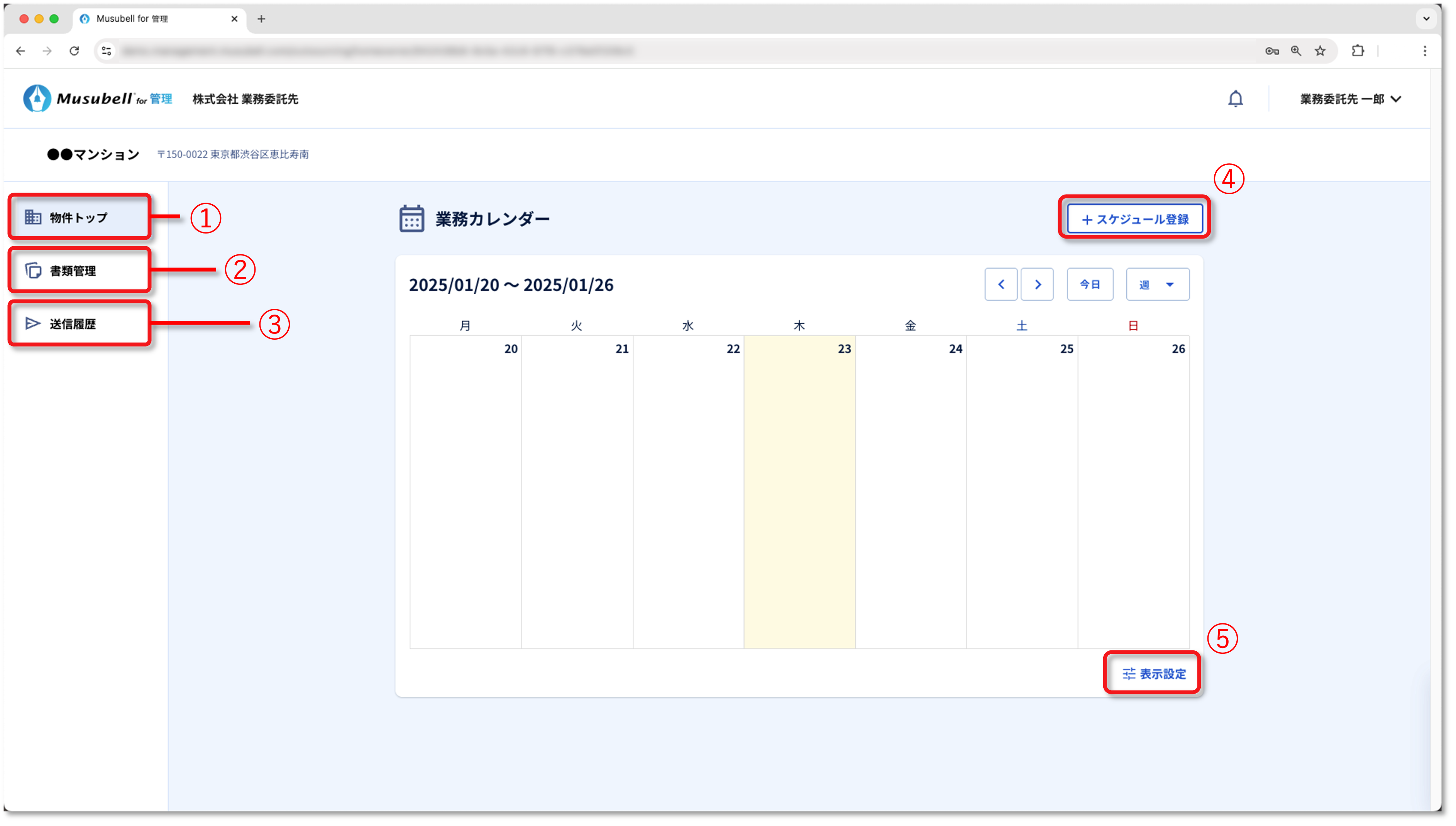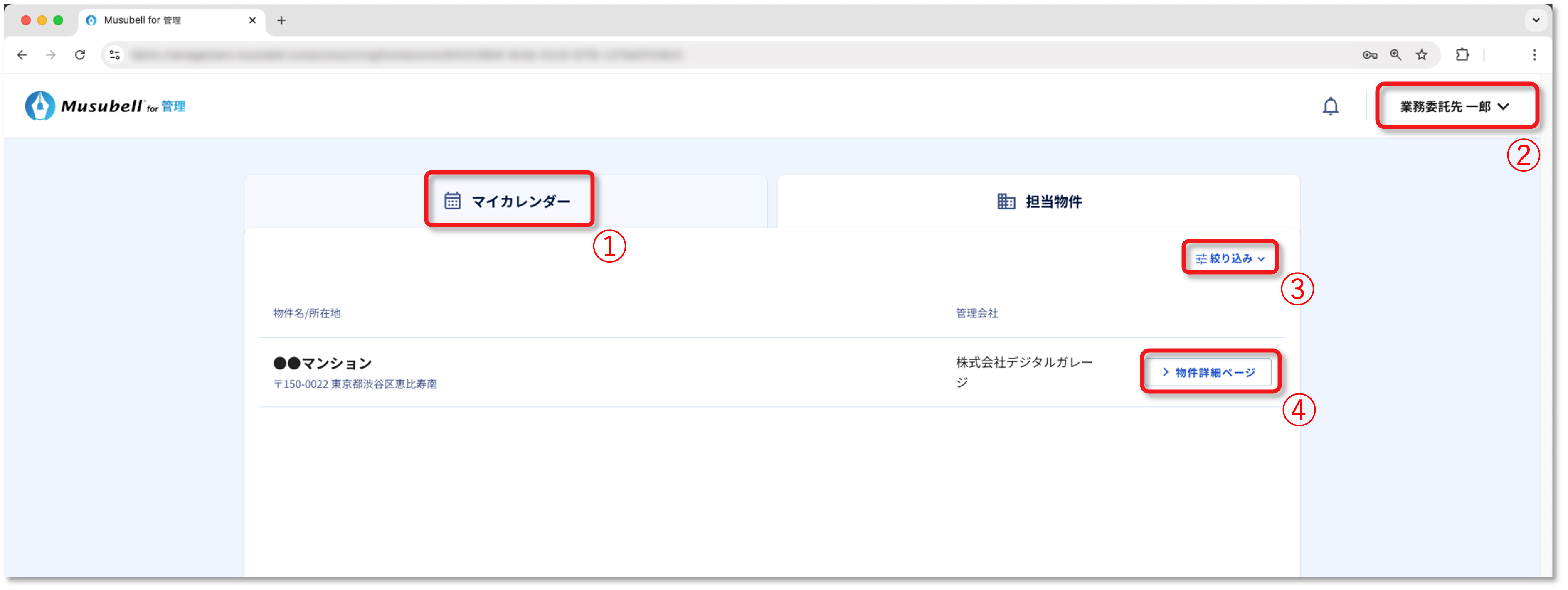 物件詳細ページのトップ画面です。その物件の業務カレンダーが確認できます。