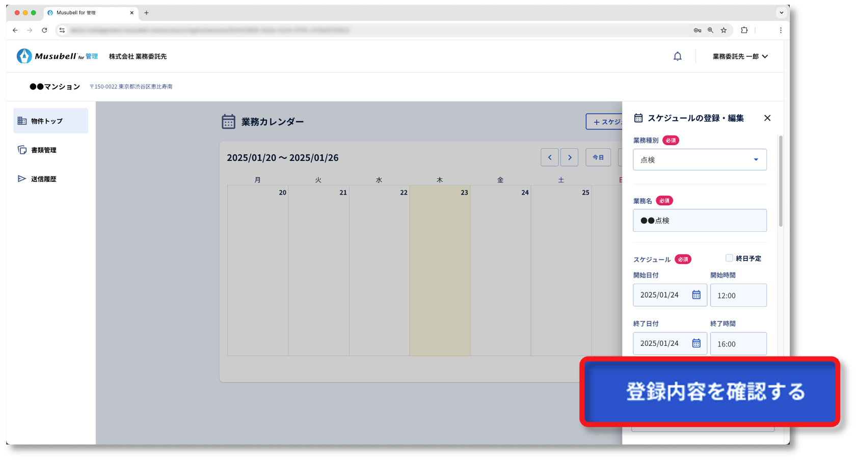 ②業務種別/業務名/日時/内容をそれぞれ編集し、[登録内容を確認する]を押します。