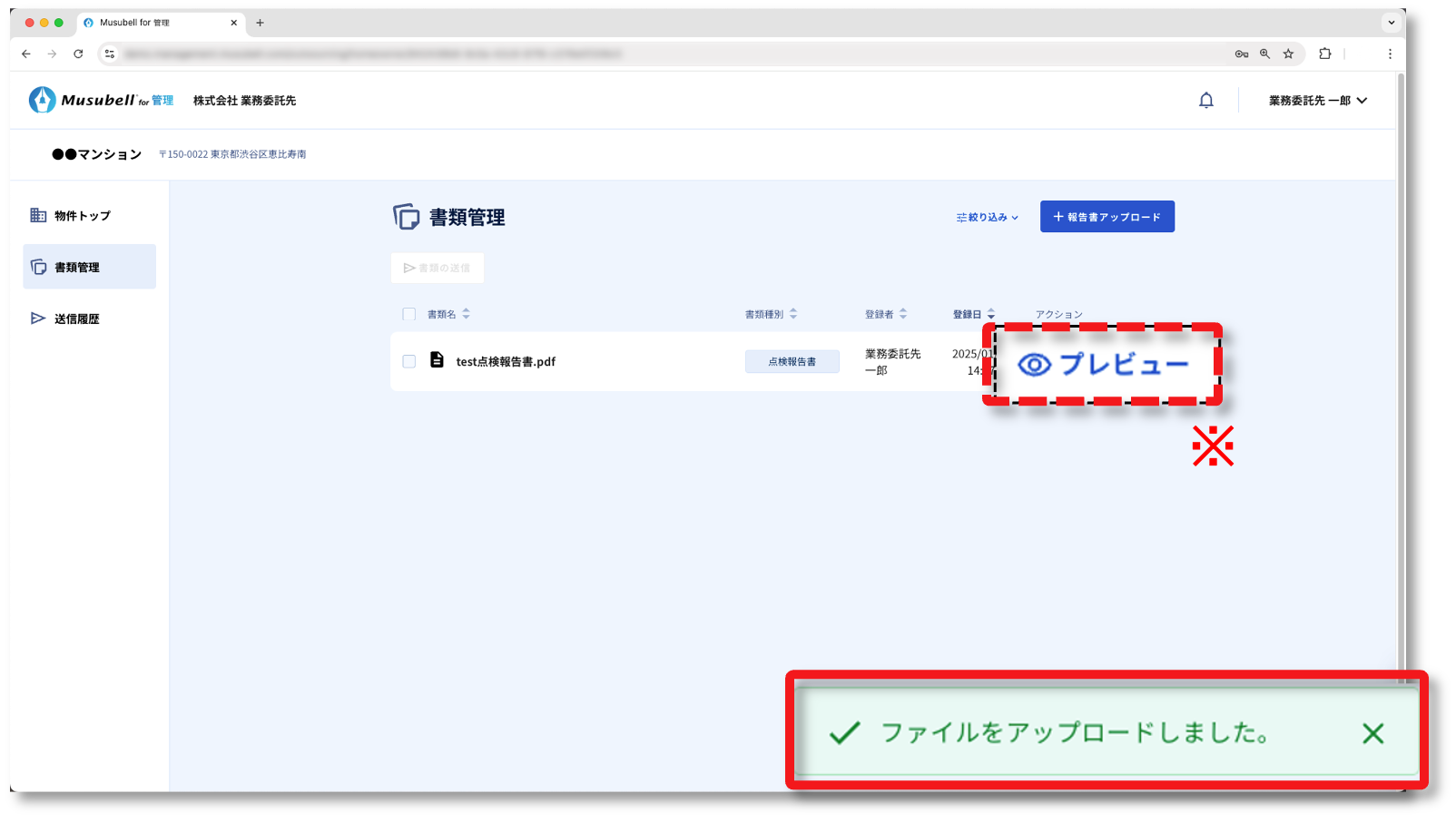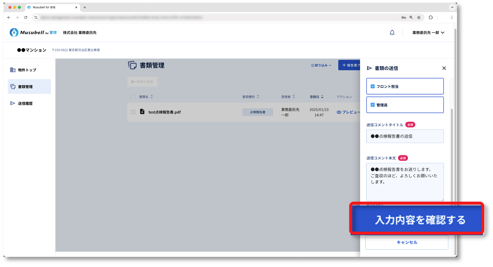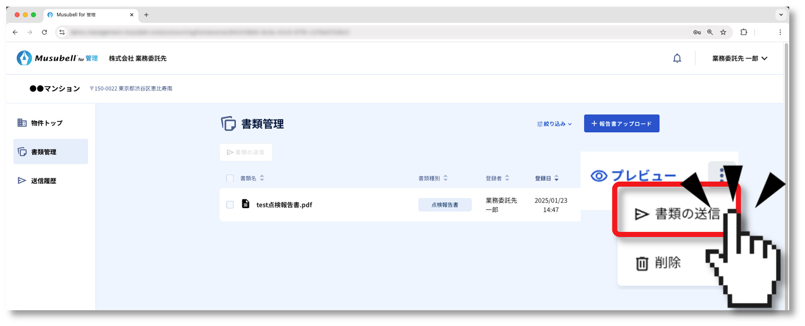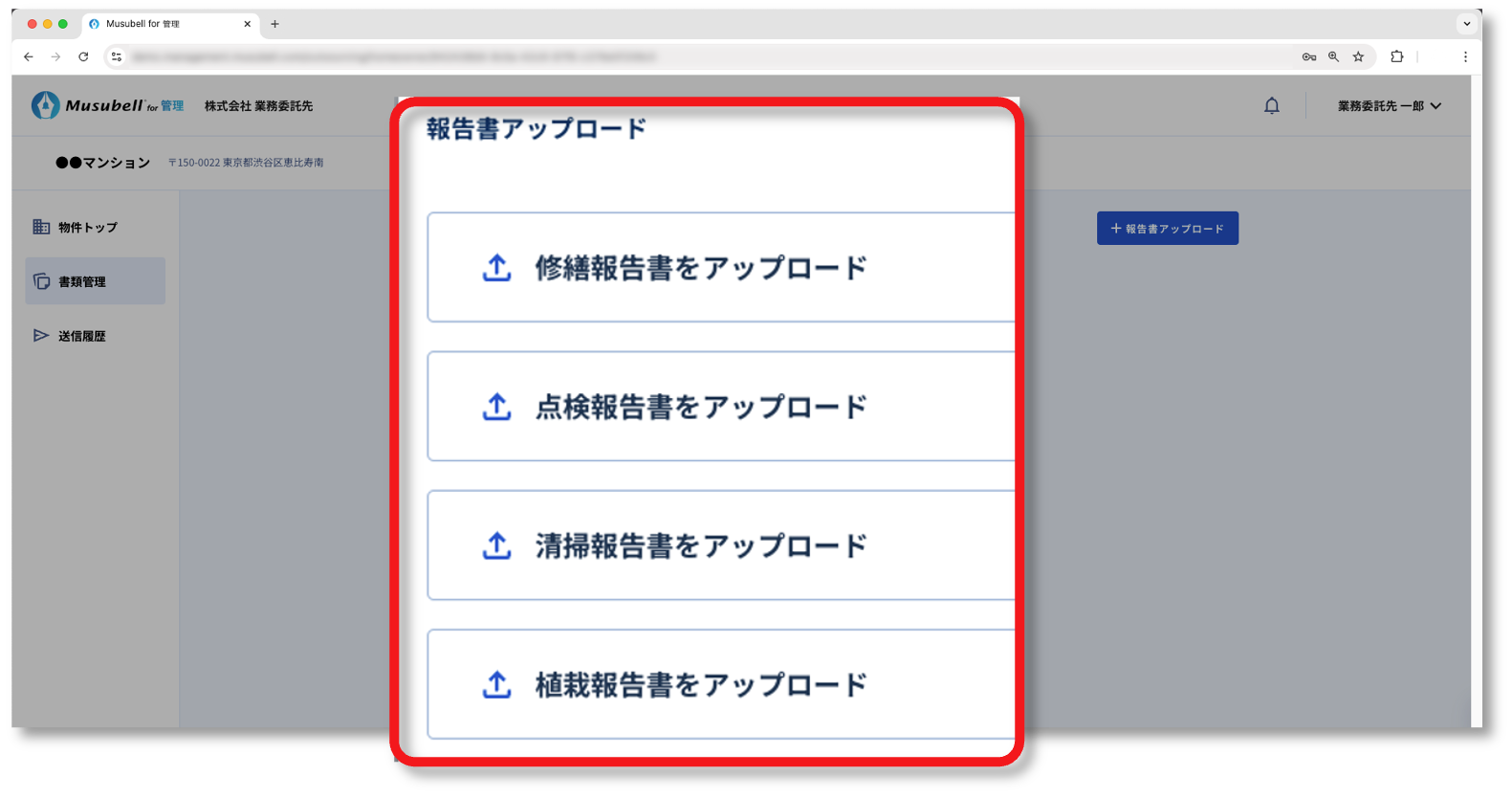 ここでは、書類(報告書)をMusubellにアップロードして、管理会社に提出する手順について説明します。