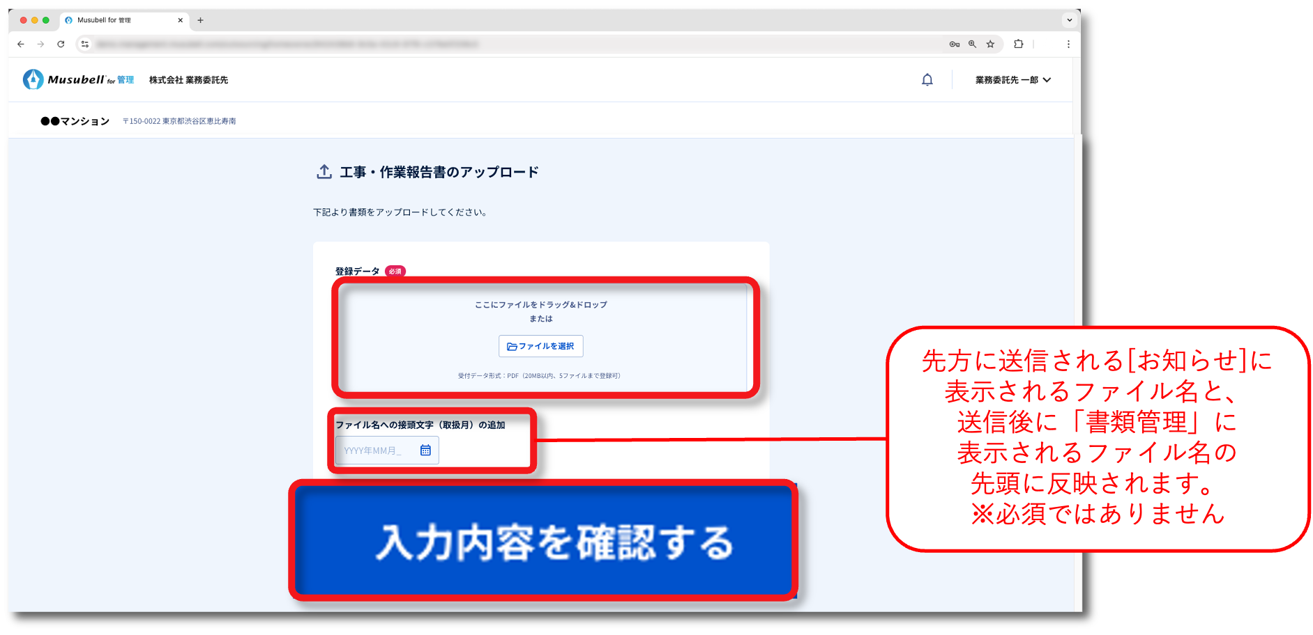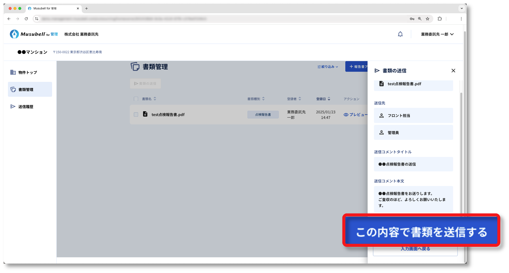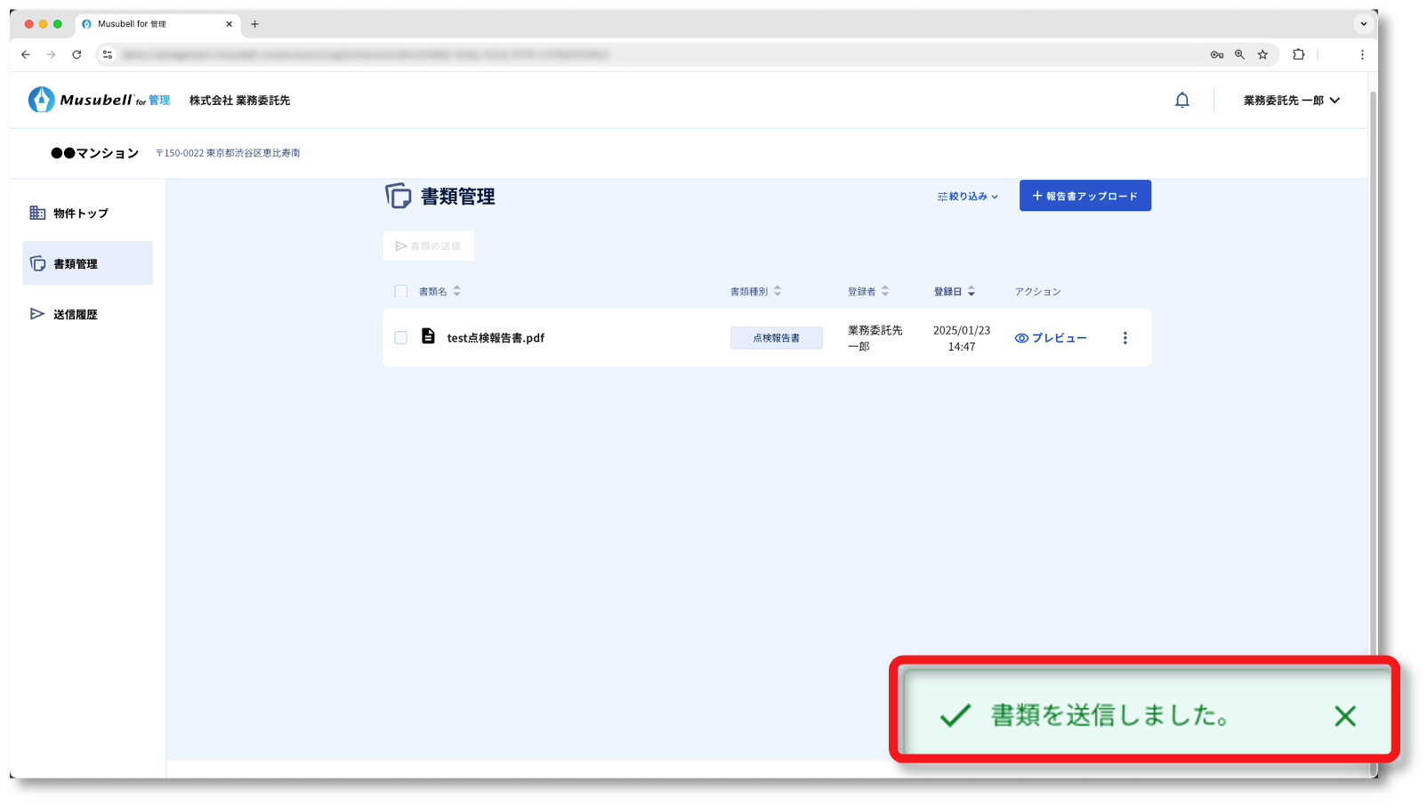 ここでは、書類(報告書)をMusubellにアップロードして、管理会社に提出する手順について説明します。